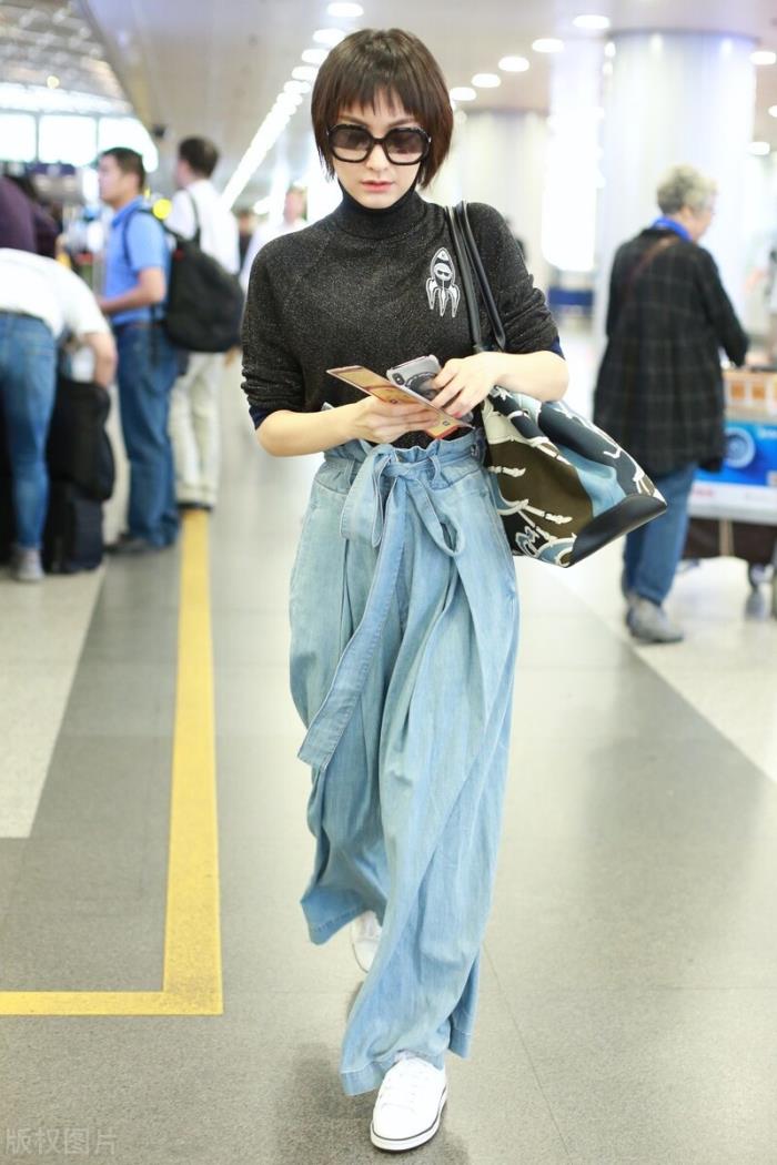 吴昕黑色高领毛衣+高腰牛仔阔腿裤精致优雅涂鸦手袋+墨镜+小白鞋潮流有范。