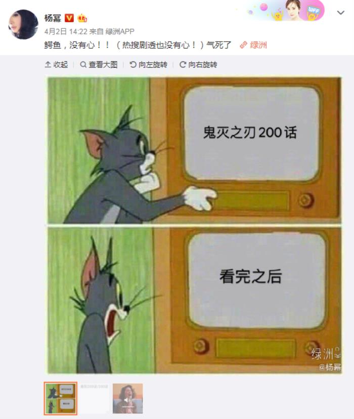 说到杨幂,相信网友们一定都非常熟悉吧?就在近日,关于她的一条“新闻”又被网友们顶上了热搜!热搜内容是:“杨幂:鳄鱼没有心”!先简单的说一下事情的起因:2020年4月2日下午,杨幂本人发了一条微博!微博内容是:“鳄鱼,没有心!(热搜剧透也没有心!)气死了!”正文下方还配上了痛苦的表情包!(鳄鱼是漫画《鬼灭之刃》的作者!杨幂这是在为主角的悲惨命运而难过!除此之外,她还被热搜剧透了!)