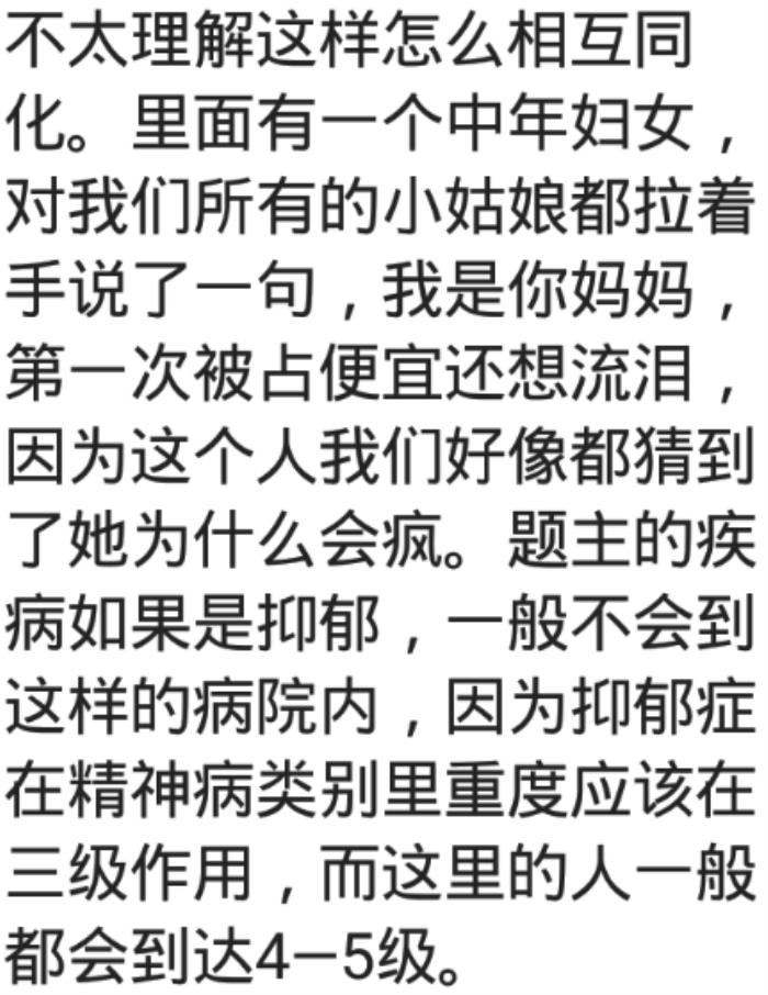 网友:我是护士,在全封闭(重症)里待过,看过很多病人,他们发病都有前兆,一般都处于正常,而且。。。都挺乖挺可爱的(不乖会被绑起来治疗,比如电击),最后。。。我觉得精神病都是天才