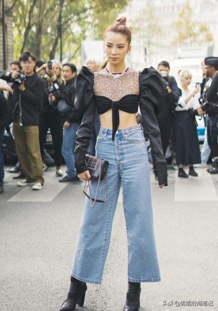 而这种加了破洞元素的老爹裤就更有时尚气息了,破洞位置越高,越显身高。配一件短上衣,腰身曲线立马出来了,这也就弥补了老爹裤不能修身的缺点,让整个身材比例更协调,高、瘦、美的时尚气场up up .