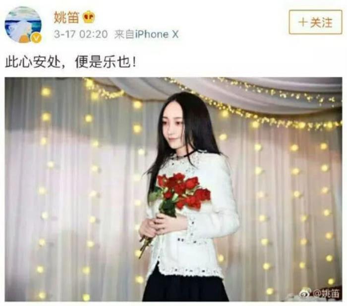 这之后,姚笛也很难再在主流影视剧中担任主角,2017年的玄幻大剧《择天记》中,姚笛仅做为“特别演出”出演了一个角色。好在,姚笛还是找到了自己的幸福。2017年7月17日深夜11点半,姚笛微博上写了两个字:是的。由此曝光了恋情,2018年3月17日姚笛36岁生日这天,姚笛成功获得了男友的求婚。