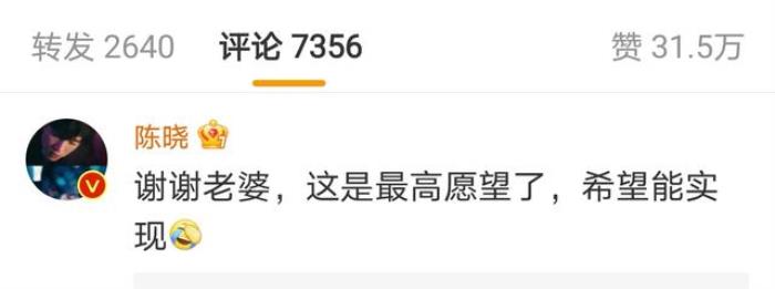 想必陈妍希看到也是很心疼吧,不想让他太累,所以才希望老公天天都有懒觉睡,陈晓也在下方回应道:“谢谢老婆,这是最高愿望了,希望能实现。”睡懒觉被陈晓认为是最高愿望,看来确实很辛苦啊!