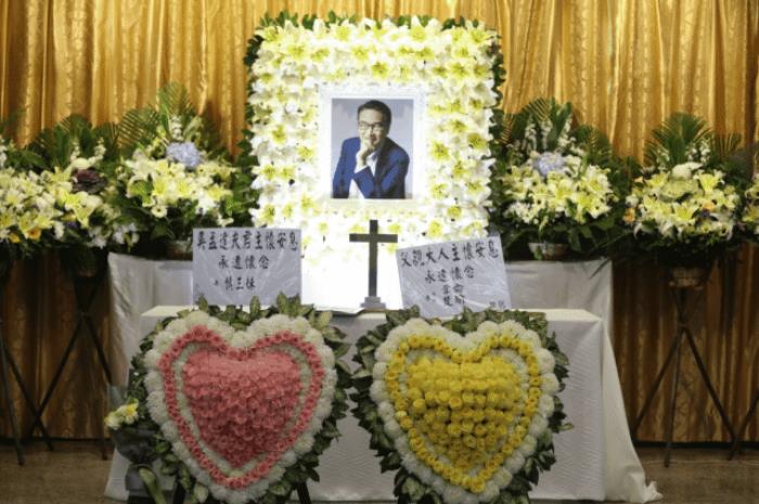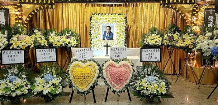 吴孟达灵堂中央写上主怀安息,现任太太侯珊燕以“侯三妹”名字送上心形花篮,跟儿子韦仑以及女儿楚瑜的心形花牌同放在正中央,两边还有达叔前妻麦莉莉和双胞胎女儿凯欣、凯儿的花篮。