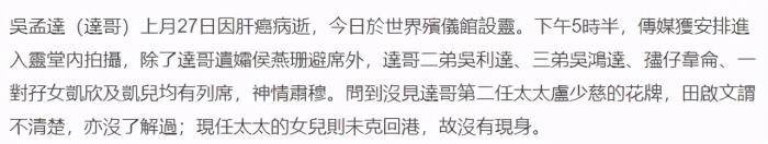 现场图片所见,吴孟达二弟吴利达、三弟吴鸿达、儿子吴韦仑,以及达叔与首任太太麦莉莉所生的双胞胎女儿凯欣和凯儿站在第一排,神情肃穆。