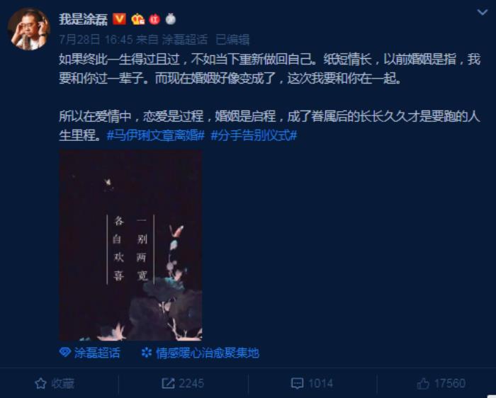 评价马伊琍文章离婚:“如果终此一生得过且过,不如当下重新做回自己。纸短情长,以前婚姻是指,我要和你过一辈子。而现在婚姻好像变成了,这次我要和你在一起。所以在爱情中,恋爱是过程,婚姻是启程,成了眷属后的长长久久才是要跑的人生里程。”