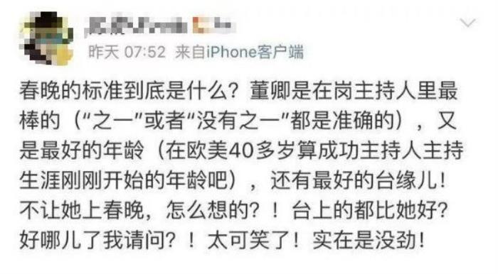 董卿不再上春晚主持了,不少网友都觉得惋惜,有人更是微博发问“春晚的标准到底是什么?”,来为董卿打抱不平。