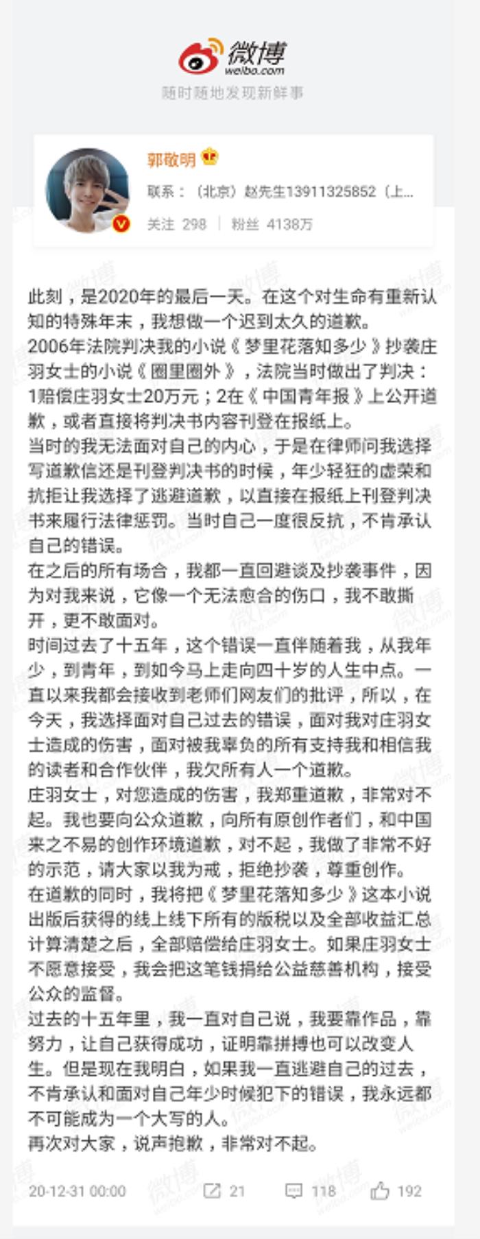 2020年12月31日,郭敬明就小说《梦里花落知多少》抄袭《圈里圈外》一事,在公共社交平台上向作家庄羽致歉,并表示将用小说的所有收益用来成立基金。