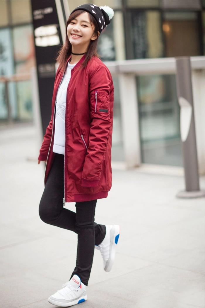 虽然说棒球服这段时间不是很流行了,但是不可否认的是,棒球服这种单品依旧是非常时尚的单品,而且非常百搭,照片中的谭松韵上半身内穿了一件白色圆领卫衣,外身搭配了一件长款棒球服,头顶佩戴着波点毛线帽,就像一个刚刚放学的高中生一般单纯。