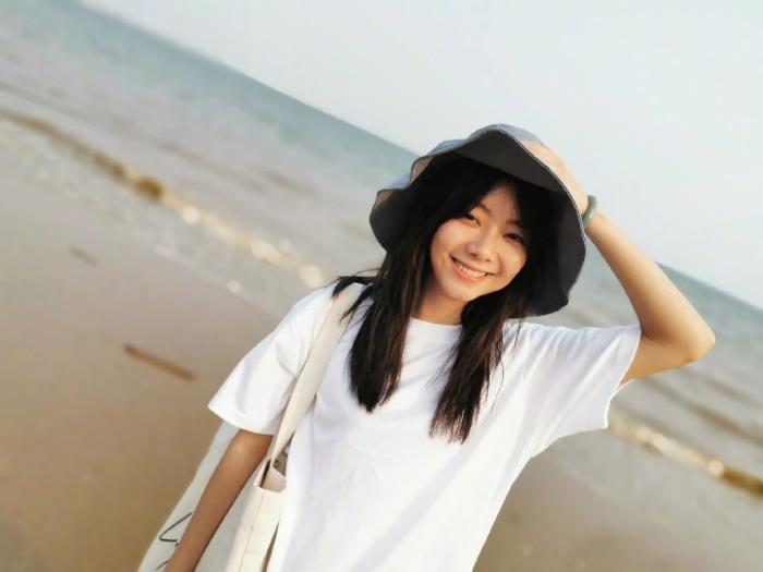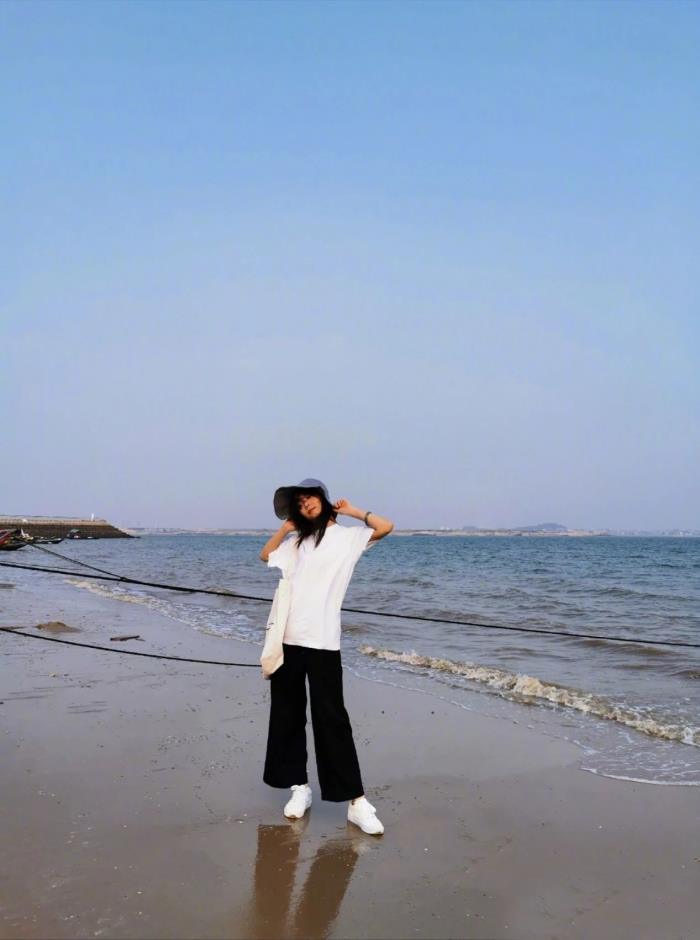 九零后的女孩子大部分都很喜欢穿着宽松款式的衣服,谭松韵自然也不例外,照片中的她上半身穿着一件白色短袖T恤,这件T恤为宽松款式设计,这种款式的T恤能够让自己显得很随性,画面中她站在海边,随风展望的样子很清新。
