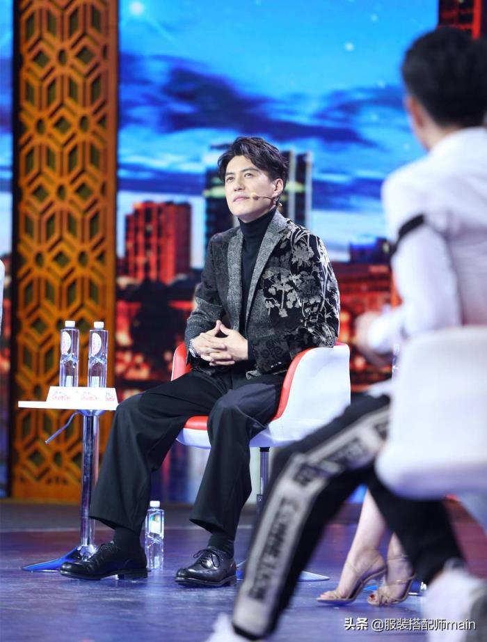 西装最般配的内衬就是衬衫,靳东也尝试过不少,他用西装搭配过白色衬衫,配上领带给人一种非常商业的既视感,他也用西装搭配过蓝色衬衫,不系扣不扎领带的衬衫版型像极了挥金如土的公子哥。而这次他用刺绣款翻领西装内搭了一件黑色高领衫,一副韩国欧巴的既视感太让人入戏了,简直和韩剧里走出来的男主角一毛一样。