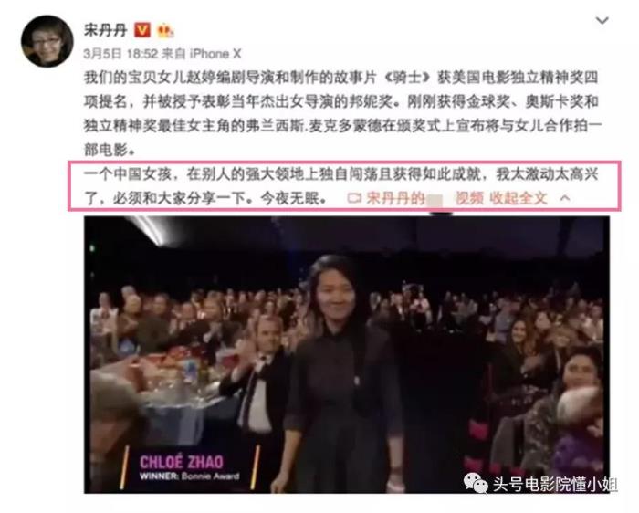 早在两年前,“赵婷编剧导演和制作的故事片《骑士》获美国电影独立精神奖四项提名,并被授予表彰当年杰出女导演的邦妮奖。刚刚获得金球奖、奥斯卡奖和独立精神奖最佳女主角的弗兰西斯.麦克多蒙德在颁奖式上宣布将与她合作拍一部电影”时,宋丹丹就曾经骄傲地叫她“宝贝女儿”,称赞道: