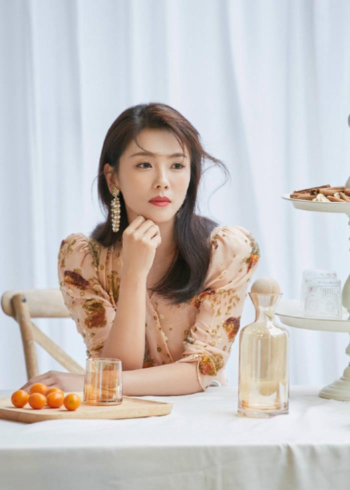 近看刘涛的脸,她的五官和妆容都十分精致。刘涛将一头秀发披散下来,搭在胸前,看起来十分随意却又感觉很甜美。她的下巴非常尖,是标准的瓜子脸,脸部的线条也很流畅,脸上晕染的腮红也让她多了几分羞涩,看起来少女感十足。