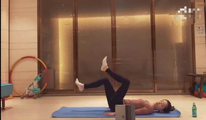做运动时,章泽天一直看看摆在前面的平板电脑,跟着教程,在瑜伽垫上不停地变换动作,动作的难度让人感觉会非常累。