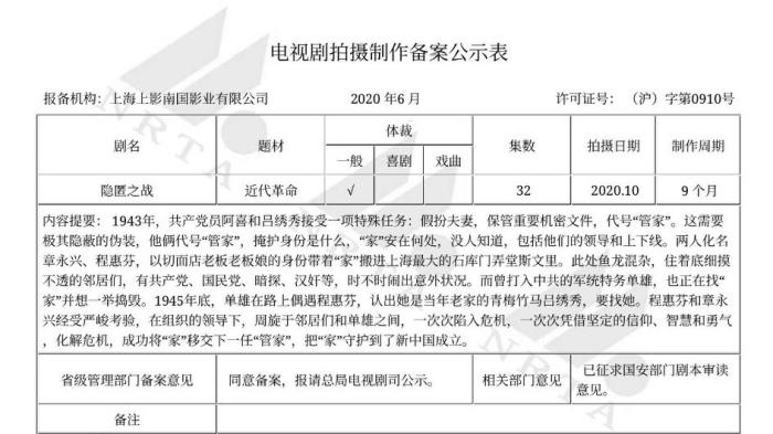 谍战剧《隐匿之战》讲述1943年,共产党员阿喜和吕绣秀假扮夫妻,保管重要机密文件,代号“管家”。此处鱼龙混杂,住着底细摸不透的邻居们,有共产党、国民党、暗探、汉奸等,时不时闹出意外状况。而曾打入中共的军统特务单雄,也正在找“家”并想一举捣毁。经历重重险阻与斗智斗勇,他们终于将“家”完整的交到下一任“管家”手中,出色的完成了组织交给的任务。该剧目前导演与主演阵容不详。