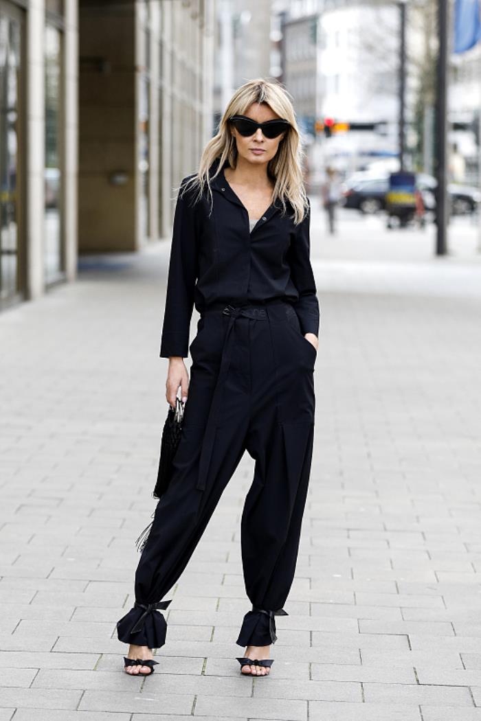 这两年很流行顺色穿一套,那用在黑色衬衫的搭配上也是不错的.比如穿一件黑色的衬衫,真丝的或三醋酸的都不错.大气又有高级感.搭配一条黑色的直筒裤,然后把裤角用黑色的缎带绑起来,有点工装裤或灯笼裤的样子.时髦又有街头感,