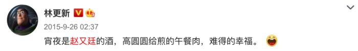 9月25日是赵又廷的生日,林更新在社交平台上发文为好友庆生,并配文道:"祝福也许会迟到,但从不缺席。赵又廷生日快乐铁汁,手机里实在没有照片了,这说明我们好久不见了,网上这点丑照原来都是我贡献的,谁有他丑照啊,发一点呀 。"