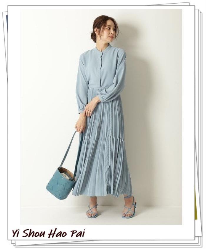 这是流行的百褶裙,褶皱会给穿搭增添律动感,柔软的面料也非常轻盈飘逸。全身的浅蓝色穿搭令人耳目一新,轻熟女人可以尝试。