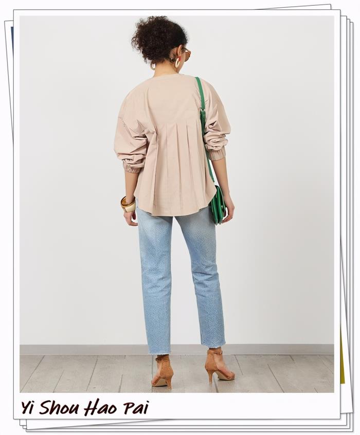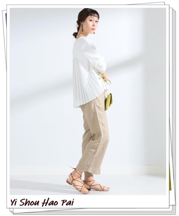 背面百褶设计的百褶上衣很整洁,简单搭配米色裤子,柔和而优雅。