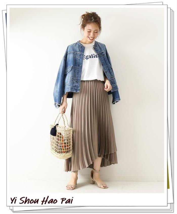 百褶裙搭配牛仔外套和字母T恤,休闲时尚。下摆的不对称设计让你更有时尚气息。