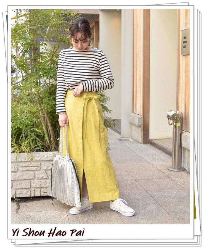 黄色的长裙和银色的百褶包搭配在一起。得益于闪亮的百褶包,经典的条纹衫也显得清新。