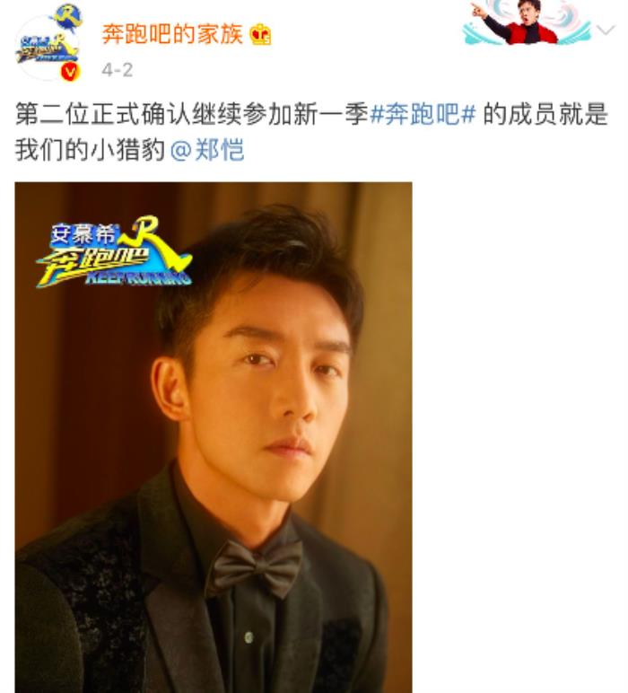 第二位便是郑恺了,本次的郑恺将继续以小猎豹的身份继续参加新一季奔跑吧,海报照也是帅帅哒!