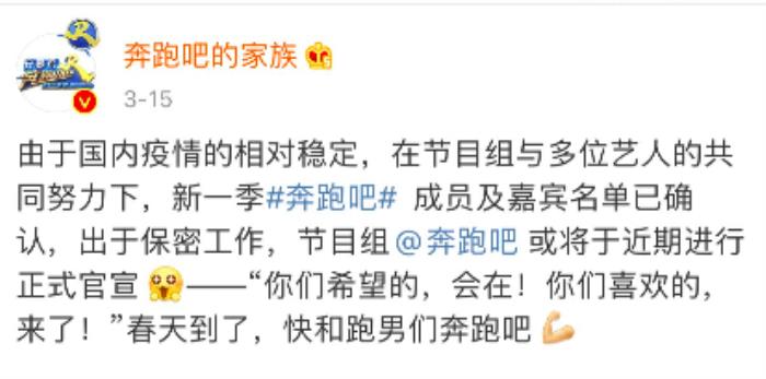 想必对于很多平日里经常喜欢看娱乐类综艺节目的观众来说,《奔跑吧》他们一定都看过,而今年由于比较特殊,故而奔跑吧的录制相对比往年延后了一些,不仅在前几日的时候,官方出来宣布节目已经选好了嘉宾,马上拍摄!