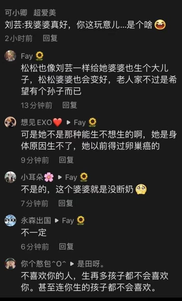 我在某音上看到这个片段的时候,有网友评论说陈松伶要是像刘芸一样也生个大儿子,她婆婆肯定会变好的。陈松伶跟婆婆矛盾的症结点真的是因为松松不能生育吗?我倒不这么认为。