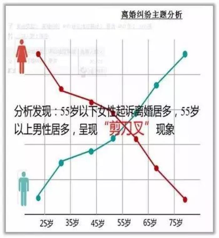 提出离婚的,25岁之前女性占了大头。30岁以后男女逐渐接近,到了55岁以上则是男性居多,呈现出一种“剪刀差”现象。
