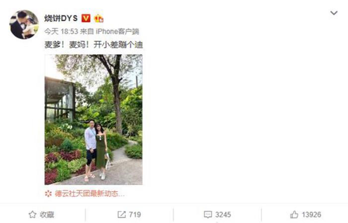 4月14日晚,德云社相声演员、郭德纲弟子烧饼发文:“麦爹!麦妈!开小差蹦个迪!”文后,他晒了一张与妻子的合照,评论区里,网友们纷纷留言:@阿陶宝宝的小狐狸:饼嫂好美;@雲霄九鶴丫:咱媳妇真好看;@非常叛逆的咸鱼:每次看到嫂子都在感慨,饼哥人格魅力太强大;@他们是角儿:麦麦妈妈太好看了!@佑佑丶:人生赢家烧老师!