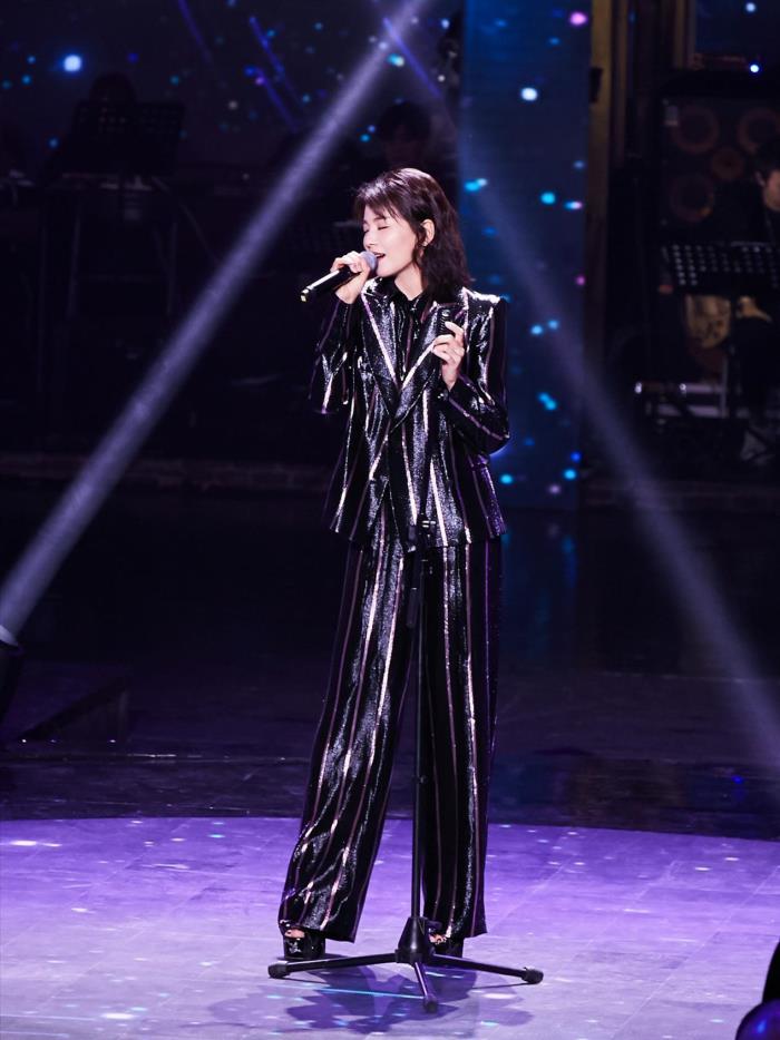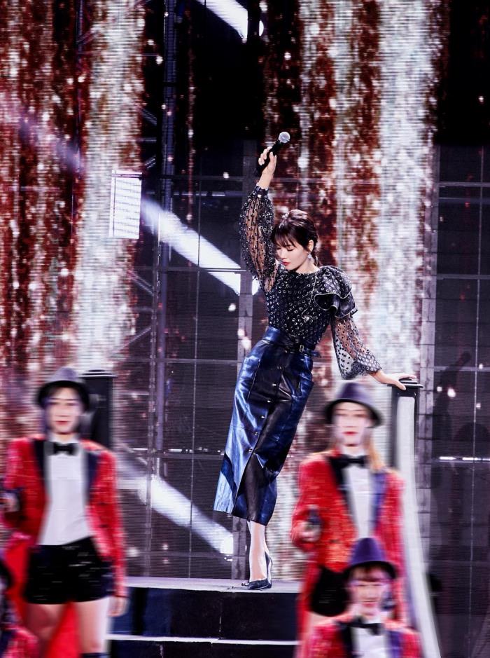 刘涛不常走性感路线,她更偏向于干练的风格,尤其是穿起西服套装来,整个人尽显英姿飒爽的女强人气质。刘涛身上的这款粉色竖条纹衬衫采用的是大面积的黑色作为底色,这个造型让刘涛看起来颇具魅力。西服在紫色灯光的照耀下呈现出的是梦幻的颜色,整个人在舞台上闪闪发亮。对于不喜欢哑光面料的女性而言,这么一款能够让你在人群中发光的西服套装更能够吸人眼球。