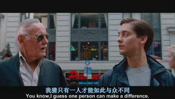 2007年《蜘蛛侠3》,彼得·帕克路过LED屏,李老爷子走近他身边,说:“我猜只有一个人才能如此与众不同,无需多言。”