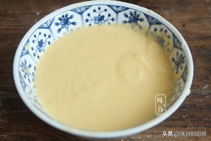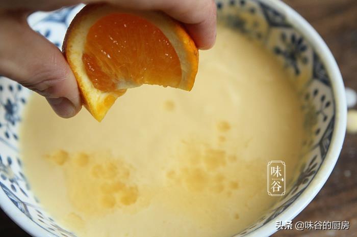 挤几滴橙汁进面糊里,柠檬汁也可以,目的是去除鸡蛋的腥味,然后搅拌均匀,拿起碗震几下,震出面糊里的气泡。