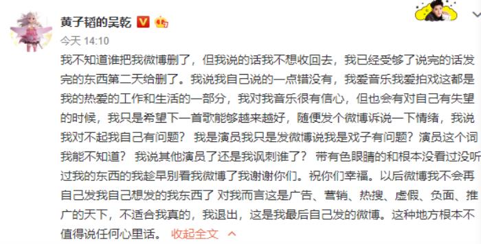 但是11月5日下午14:10,黄子韬在宣布退出的微博文字里,表示之前的微博不是他自己删除的,而且他不想收回“戏子”的说法,他觉得自己一点错也没有,甚至有点委屈,他说:“只是希望下一首歌能够越来越好,随便发个微博诉说一下情绪,我说我对不起我自己有问题? 我是演员我只是发微博说我是戏子有问题?演员这个词我能不知道? 我说其他演员了还是我讽刺谁了?”并且在文末宣布退出微博,并称“这种地方根本不值得说任何心里话”。