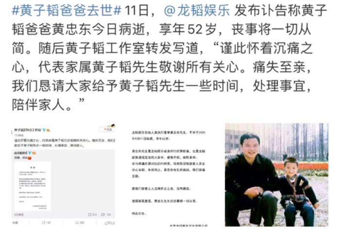 9月11日,黄子韬的公司突然发出黄子韬爸爸黄忠东去世的讣告。随即黄子韬工作室转发并恳请大家留给黄子韬一些时间去处理后事,在特殊时间段陪伴在家人身边。