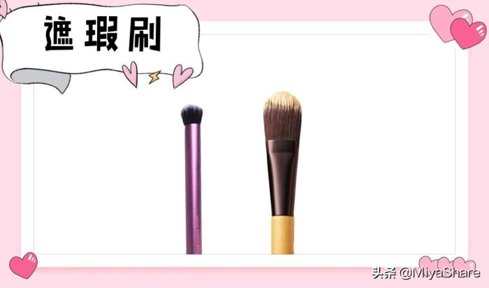 扁平刷(左二):最常见的遮瑕刷。形状扁平,刷毛厚实,质地偏硬。能够精准的蘸取遮瑕膏精准遮瑕。
