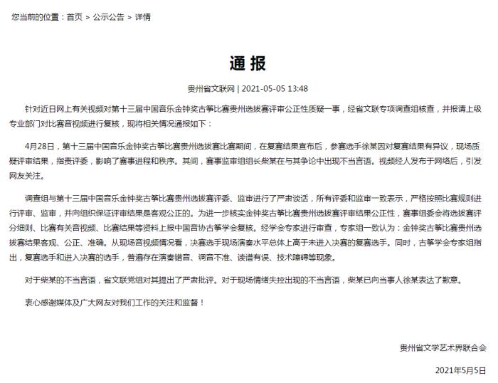 4月28日,第十三届中国音乐金钟奖古筝比赛贵州选拔赛比赛期间,在复赛结果宣布后,参赛选手徐某因对复赛结果有异议,现场质疑评审结果,指责评委,影响了赛事进程和秩序。其间,赛事监审组组长柴某在与其争论中出现不当言语。视频经人发布于网络后,引发网友关注。