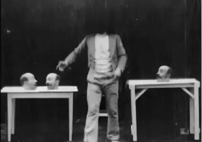 乔治·梅里爱通过在一幅胶片上拍摄多个影像的技术,拍出了电影《多头人》。