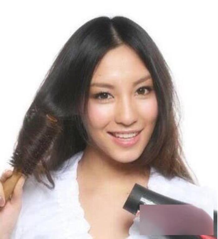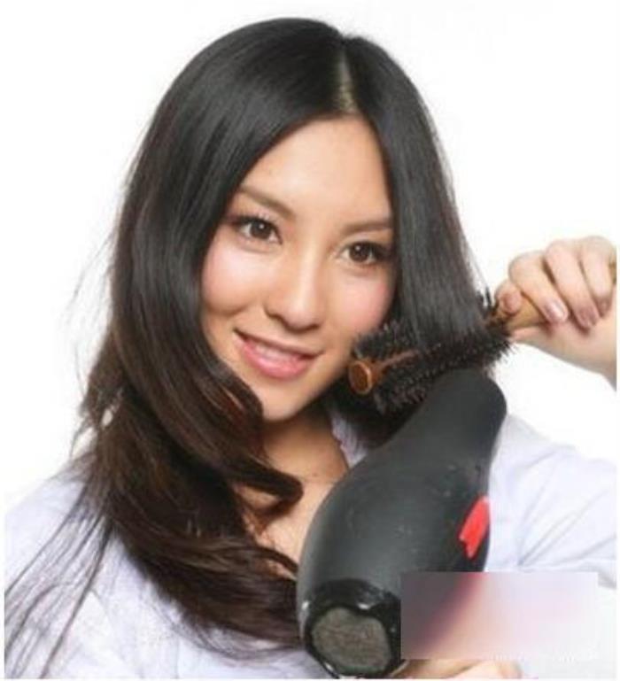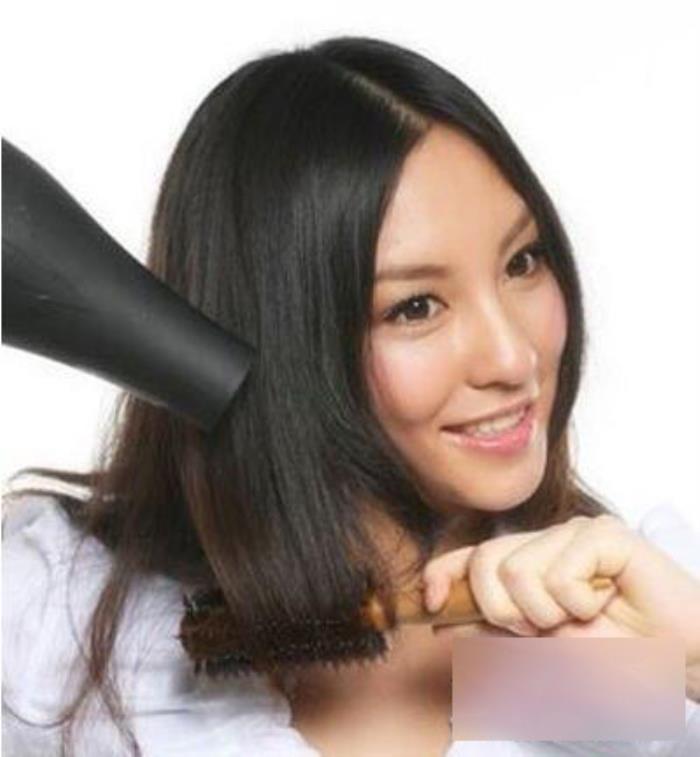 第五步:另外一侧的发丝按照同样的方法使用吹风机吹头发。