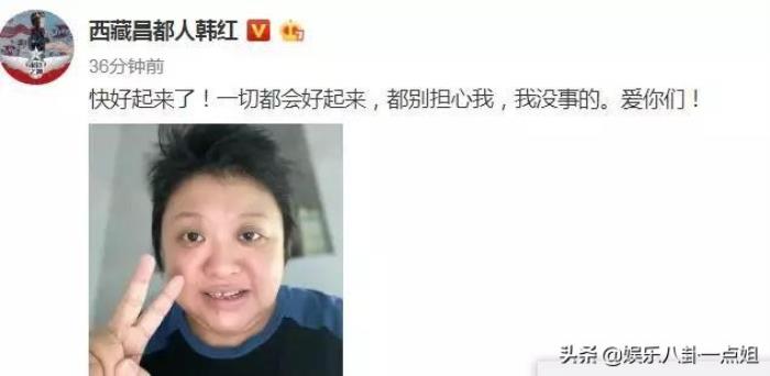 这是韩红生病后首次晒照,照片中韩红面容憔悴,黑眼圈明显,看上十分地疲劳,尽管身体欠佳,韩红依然对着镜头比耶,为自己,为武汉,为中国加油!