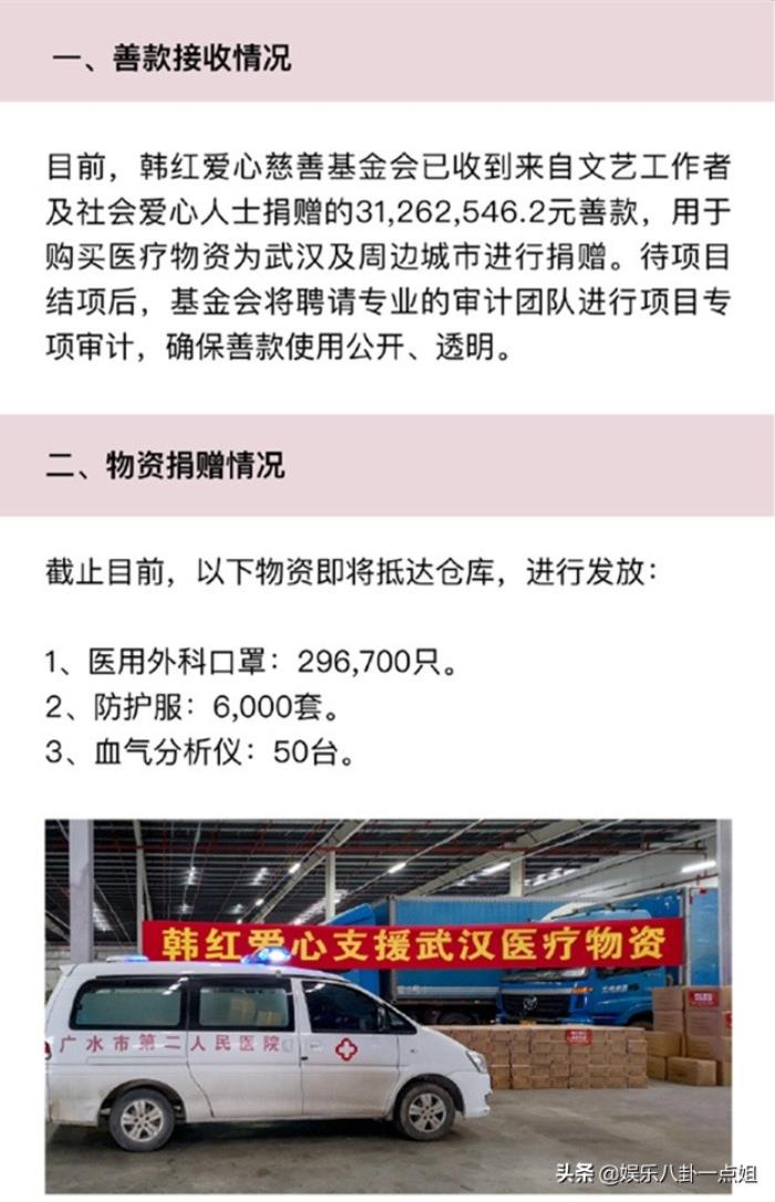 截至目前,韩红爱心慈善基金会已经收到了来自各路明星以及社会各级爱心人士的捐款三千多万,此捐款用于购买医疗物资,包括医用外科口罩,防护服,血气分析仪等,而对于款项的用途方向,韩红也反复强调会公开,透明,做到一袋方便面也能公示。