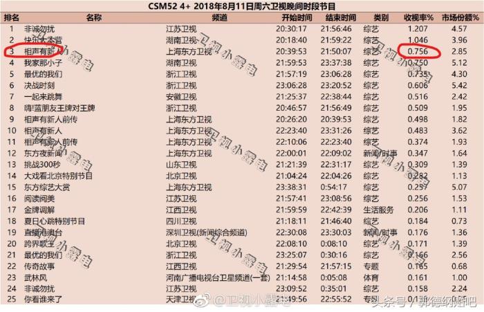 8月11日东方卫视播出的纯相声综艺《相声有新人》,顺利首播后因博士夫妻的“公式相声”而引发热议,受到广泛关注。虽然“怒怼”郭德纲让这档节目有了充分的话题热度,但跑偏的舆论也多少掩盖了此节目作为纯相声综艺的专业性,使得节目中其他的亮眼表现被消弱,四组已晋级选手的表现以及评委的精彩点评也没能成为热议话题。这对此节目的专业性传播来说算得上是一大损失。今天,周六各电视台综艺节目收视率出炉,《相声有新人》获得0.756%的收视成绩,在当晚的综艺排名中位列第三。