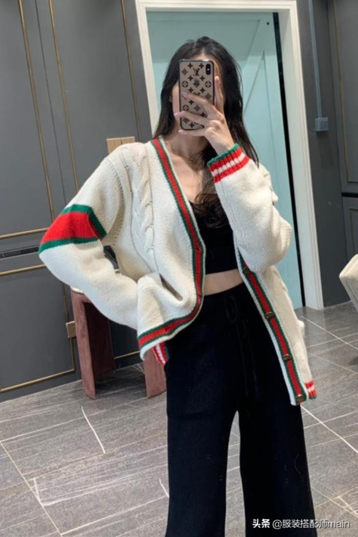 比如这套裸色针织开衫搭黑色束脚西装裤的装扮就非常适合职场人士穿。
