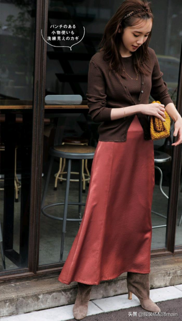 宽松的针织开衫搭配收束感半身裙,再踩一双高跟鞋,尤其显高显气韵。