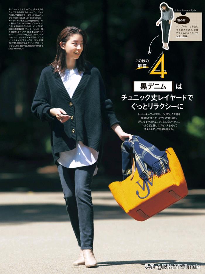 黑色针织开衫搭配蓝色牛仔裤,这套LOOK更有成熟感;