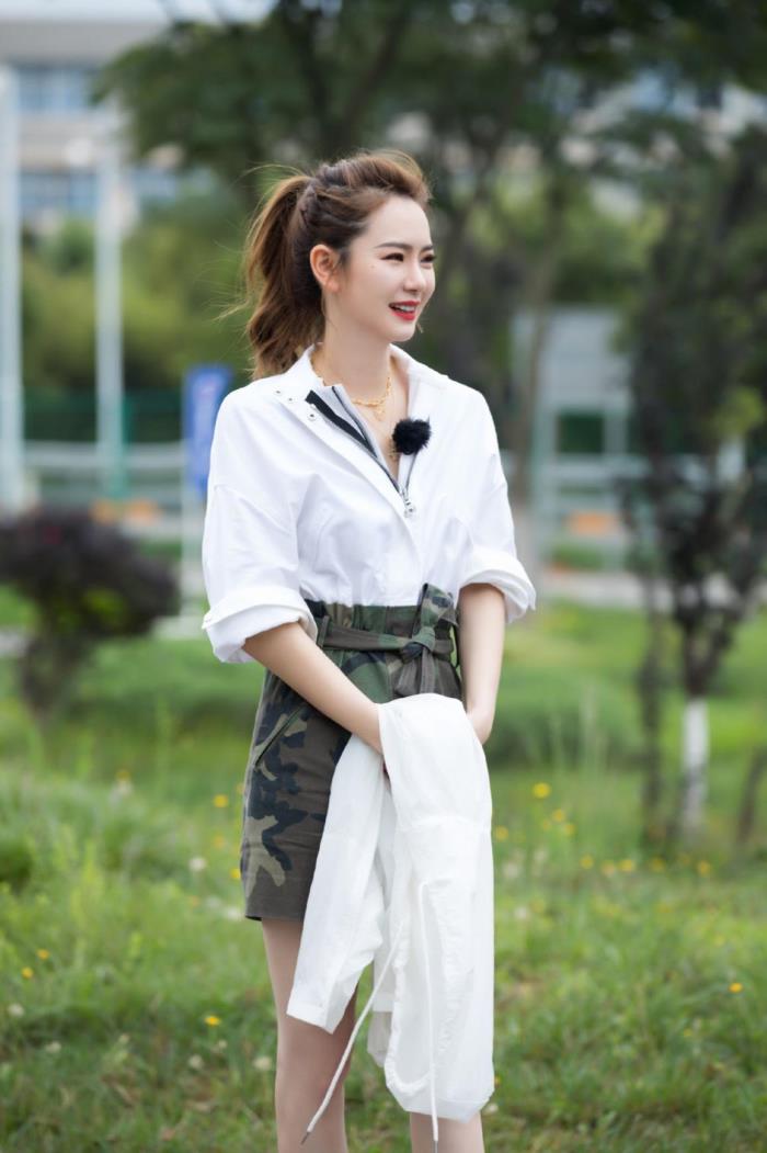 生活中的戚薇阳光又洒脱,高高的马尾配以爽朗的笑容,亲切又随和,精致的妆容彰显她对生活的热情与热爱。干净白色与迷彩的搭配清爽又帅气,高高挽起的袖口,自然大方。不需要太过华丽的装饰,一条同色系的迷彩腰带系成蝴蝶结的样式,就能美成一道风景线。