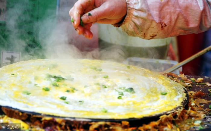 摊煎饼是整个程序中最关键的步骤,用书面文字不能表达清楚,请看VCD教学光盘实录。刚开始练手法为了省面糊,可以用干面粉倒到平面锅上用木头刮板练习,以把面粉摊匀又不掉到地下为目的;因为每个人的习惯不一样(也许有左撇子的),为了把面糊均匀摊开摊薄自己创立手法也可以,你可以转圈的摊或者从左向右、从右向左、从上向下都可以。制作煎饼的过程中摊煎饼的速度和手法是关键,所以建议你花3--5天时间(每天6小时)练手法和速度。速度慢了煎饼肯定会太厚而成本增加,手法不熟练摊出的煎饼会有的地方厚有点地方薄而不均匀。刚开始练手法很辛苦,但摊煎饼就是挣这份辛苦钱,只要迈出第一步一切就显的那么光明而“钱”途。