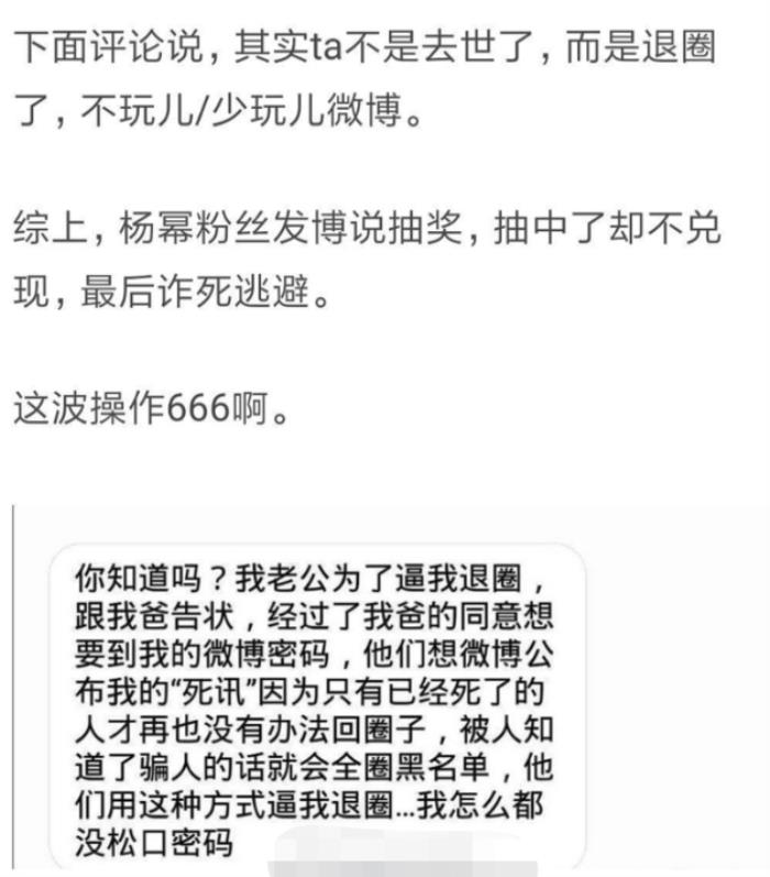 然而在杨幂与刘恺威离婚之后是个半年多之久,近日却被曝出当时参与抽奖的一位疑似杨幂粉丝的人“诈死”拒绝履行承诺,据称当时为表激动之情,发博称将抽奖包揽一位粉丝一辈子的零花钱。