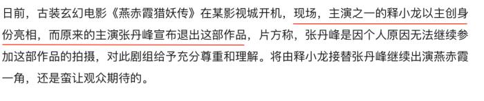本来在张丹峰拍摄完《勇者无惧》后,就会马上进入电影《燕赤霞猎妖传》的拍摄,后来新电影惨遭换角,释小龙成了他的替代者。