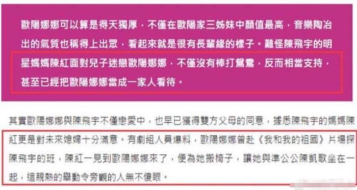 虽然,欧阳娜娜和陈飞宇一直没有承认恋情,但是近日,有台媒称,两人已确认交往,并且陈飞宇追欧阳娜娜两年,男方一家对欧阳娜娜也是十分满意。并且,欧阳娜娜在陈飞宇拍摄《我和我的祖国》时曾去探班,陈红还给她搬椅子坐。这消息一出,简直炸开了锅,如果恋情属实,那真是太甜了,这种能够得到父母认可的恋情,真是羡煞旁人。