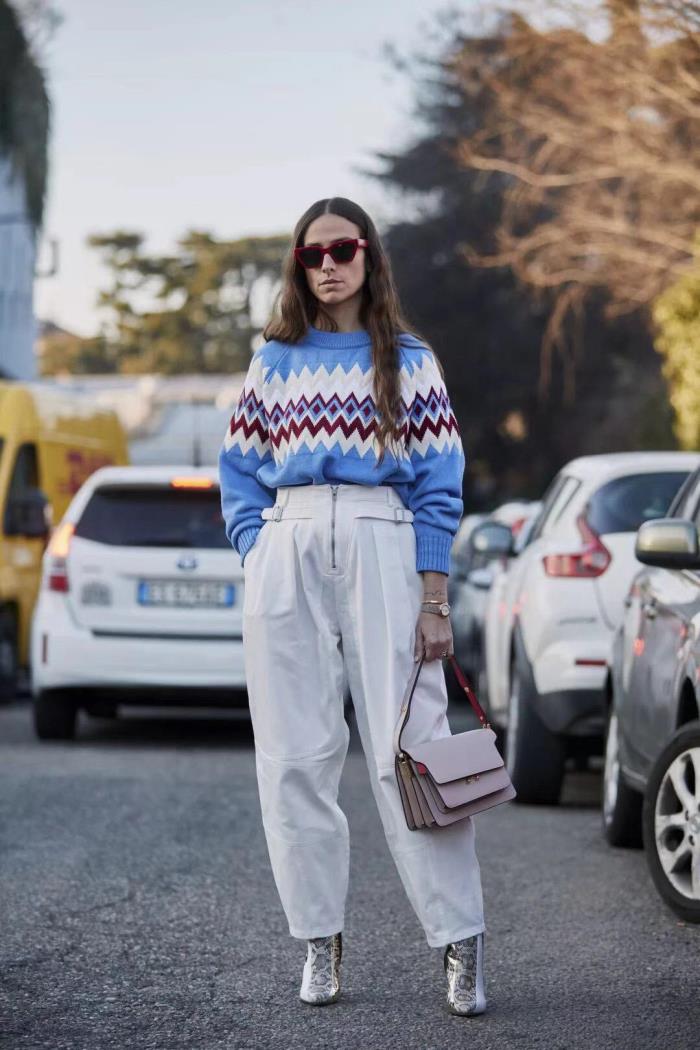 工装裤是今年秋冬人手必备的一件潮流单品,由于工装裤的设计宽松,也不挑腿型,可以随意搭配各自类型的衣服和鞋子,所以深得很多女生的喜爱。毛衣在冬天有很好的保暖作用,蓝色花纹毛衣搭配白色工装裤,真的超级干净清爽。把毛衣塞到裤子来,原本工装裤的高腰设计,能很好的拉长腿部比例线条,显高又显瘦,像屁股比较大的女生,穿工装裤还可以起到很好的修臀效果哦。